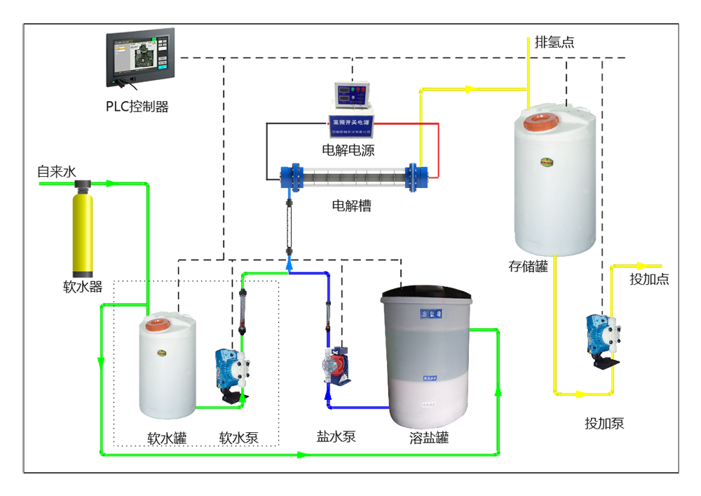 1. Soft water unit; 2. Saturated brine preparation unit; 3. Dilute brine proportioning unit; 4. Electrode electrolysis assembly unit; 5. Rectifier power supply unit;