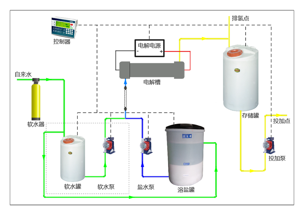 1、軟水單元;2、飽和鹽水制備單元;3、稀鹽水配比單元;4、電極電解總成單元;