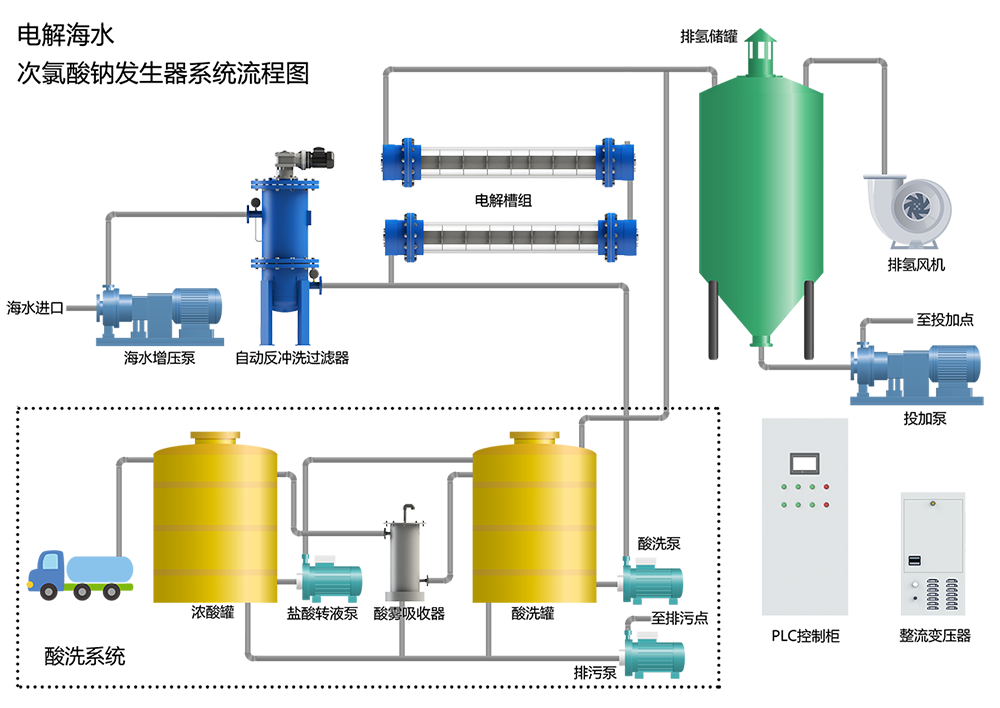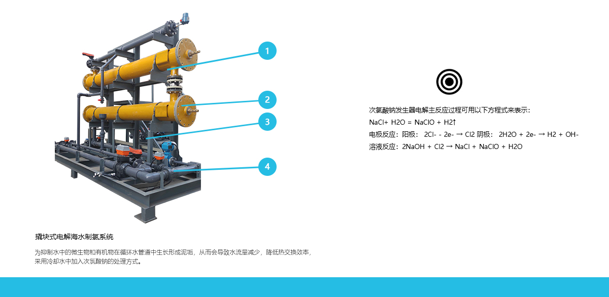 為抑制水中的微生物和有機(jī)物在循環(huán)水管道中生長形成泥垢,從而會導(dǎo)致水流量減少,降低熱交換效率,采用冷卻水中加入次氯酸鈉的處理方式。 電解海水次氯酸鈉發(fā)生裝置利用天然海水,采用高速電解,現(xiàn)場制取高活性次氯酸鈉溶液。 次氯酸鈉溶液通過脫氫貯存作為殺生劑輸送到投加點,有效殺滅水體中微生物,海生物,藻類及甲殼,防止循環(huán)水管道、冷凝器系統(tǒng)堵塞。